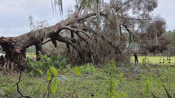 This tree was still partially attached at the root. Until it was completely detached from the root and lying on the ground, it posed a significant safety risk to the cows.